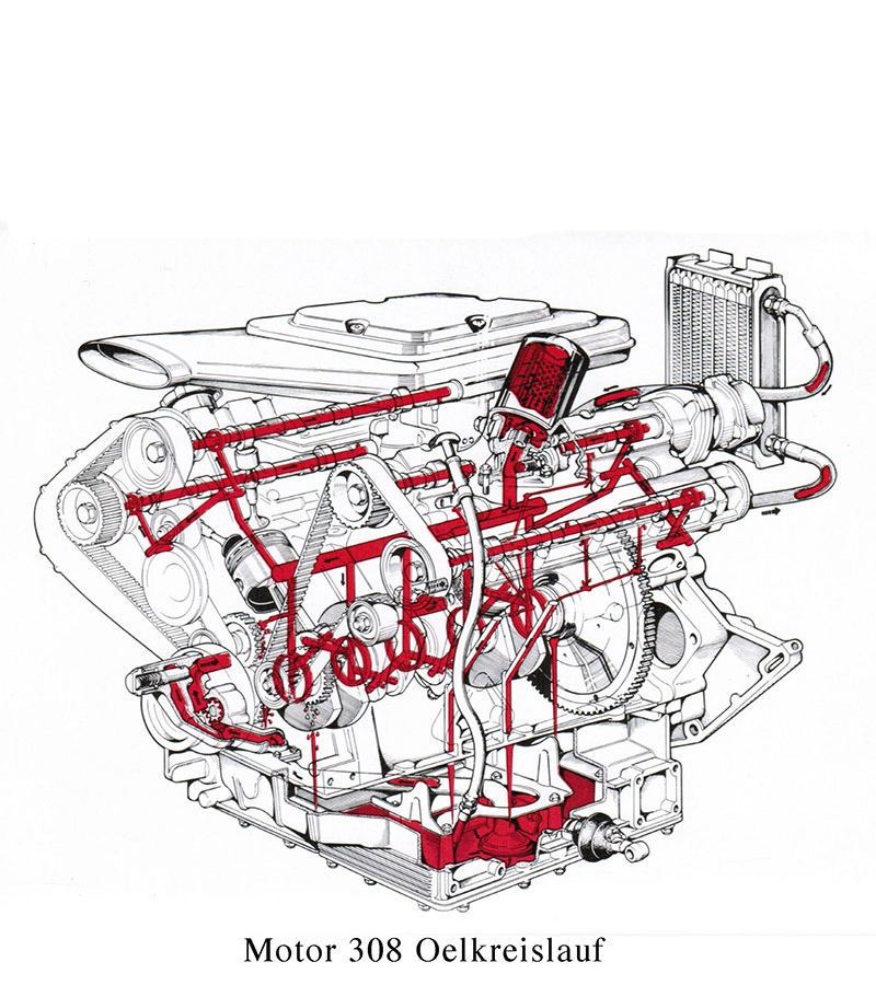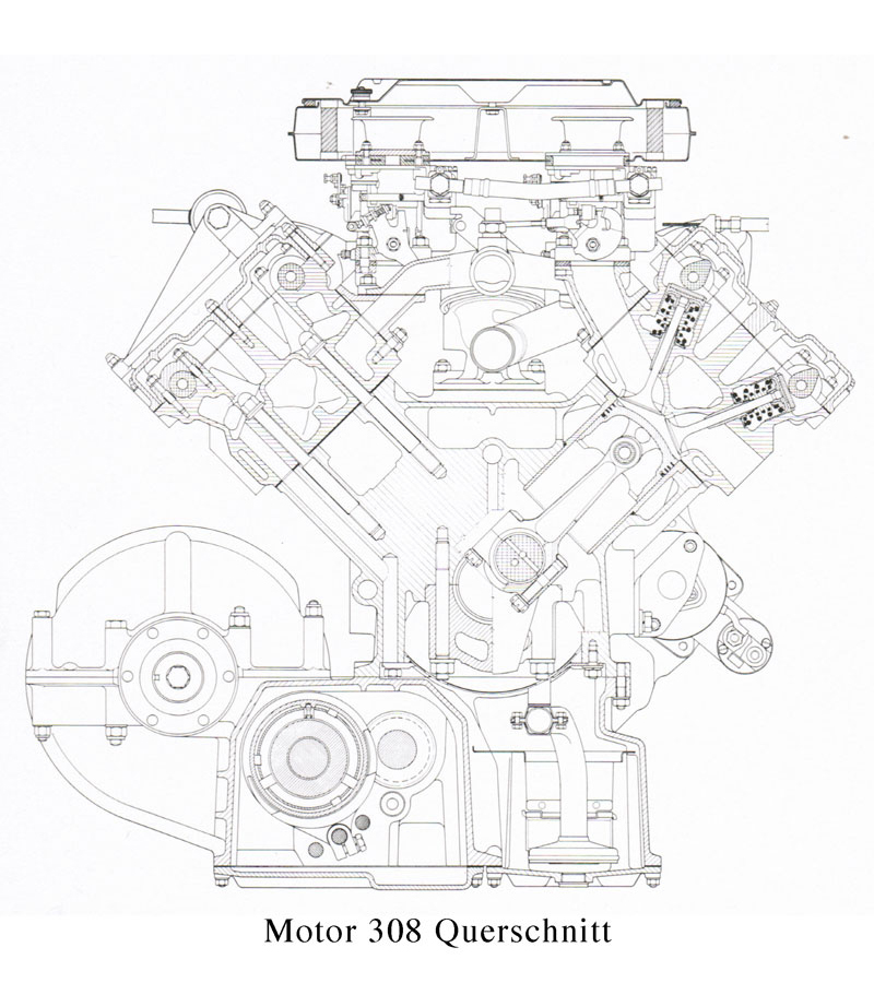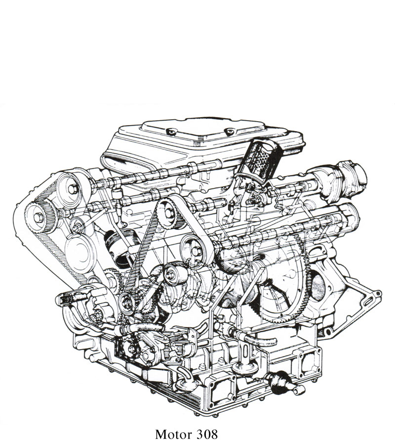 Bohrung/Hub 66.8 x 71, 1991 ccm (gleicher Hub wie 308 aber winzige Kolben !) 4 Doppelvergaser 32 DCNF 170 PS bei 6600 U/min, Drehmoment 19 mkg bei 4900 U/min, Maximaldrehzahl 7700 U/min.